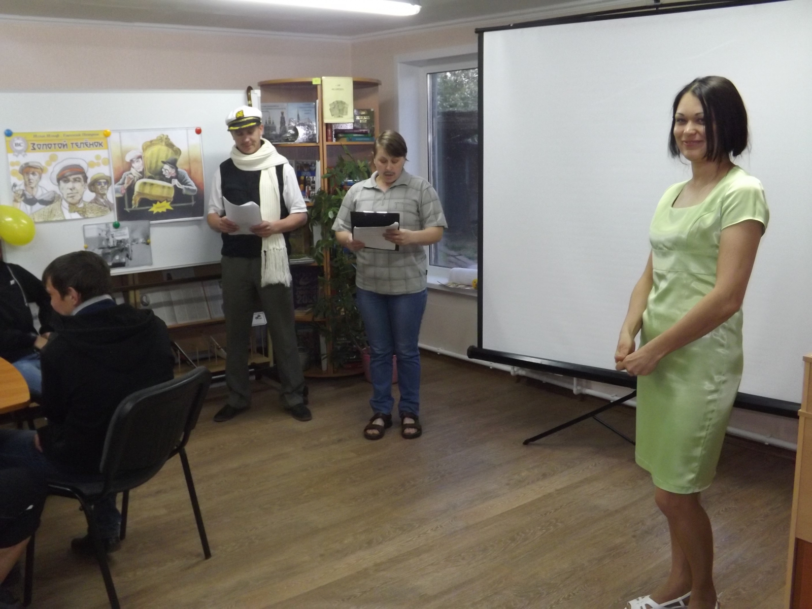 Награждение участников библионочи провели герои романа «Золотой теленок» О. Бендер, А. Корейко и З. Синицкая в исполнении К. Марченко, Е. Власовой и К. Давыдовой. О. В Аксаментова поздравила игроков с успешным завершением веселого соревнования, предложила всем желающим сфотографироваться в стенах библиотеки на память о проведенном мероприятии и оставить свои отзывы о библионочи.