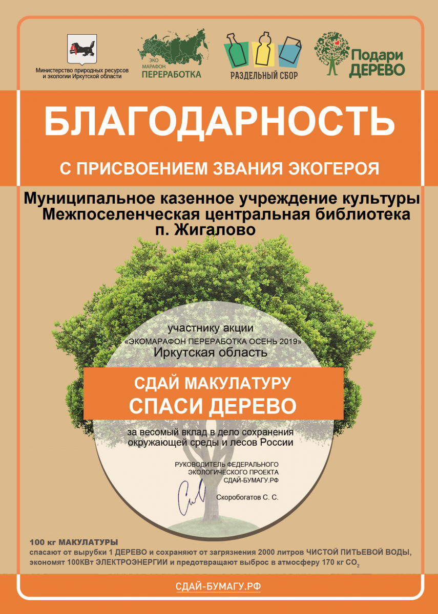 С 16 сентября по 31 октября 2019 г. в Иркутской области состоялась акция Экомарафон ПЕРЕРАБОТКА «Сдай макулатуру – спаси дерево!», при поддержке краудфандинг-проекта «Подари Дерево», Министерства природных ресурсов Иркутской области, Службы по охране природы и озера Байкал Иркутской области. На территории Жигаловского района сбор макулатуры осуществляла Межпоселенческая центральная библиотека. Результат акции: было собрано и вывезено 820 кг!