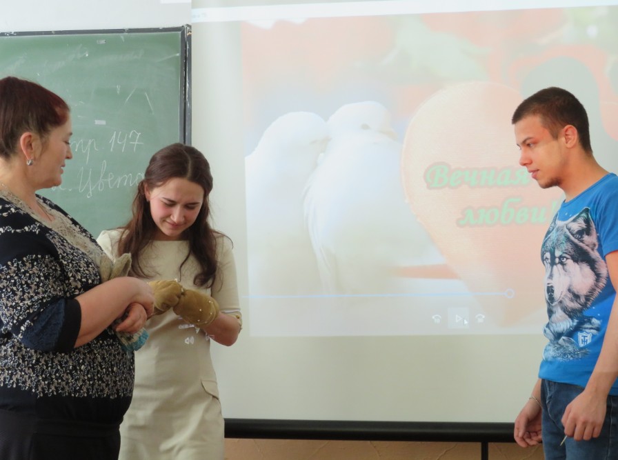 Для начала вниманию слушателей были предложены видеоклипы с лирическим песнями советской эпохи. Эти песни слушали и напевали, когда были влюблены, не только мамы и папы наших студентов, но даже их бабушки и дедушки. А песню «Вечная весна» в исполнении Валерия Ободзинского можно по праву назвать гимном любви. Что ни говорите, а старшее поколение россиян умело любить и красиво рассказать о своих чувствах! Для того, чтобы убедиться в том, что и современная молодежь знает толк в настоящих чувствах и хорошей песне, мы предложили юношам и девушкам поделиться на две команды и посоревноваться в знании лирических песен ХХI века. Задание оказалось для будущих продавцов и кулинаров сложным. Но затем члены обеих команд очень хорошо прочитали подготовленные нами известные стихотворения о любви, за что были удостоены дружных аплодисментов присутствующих. Чтение было отмечено жетонами в копилки обеих команд. После этого студенты техникума состязались в умении говорить друг другу ласковые слова и сочинять стихотворения. Пока строгое жюри подсчитывало количество заработанных командами жетонов, вниманию аудитории был предложен видеомикс из современных песен о любви. Коллектив победившей в конкурсной программе команды «правых» был поощрен сладким призом. Можно без преувеличения сказать, что наша праздничная встреча в компании учащихся техникума и их педагогов удалась.