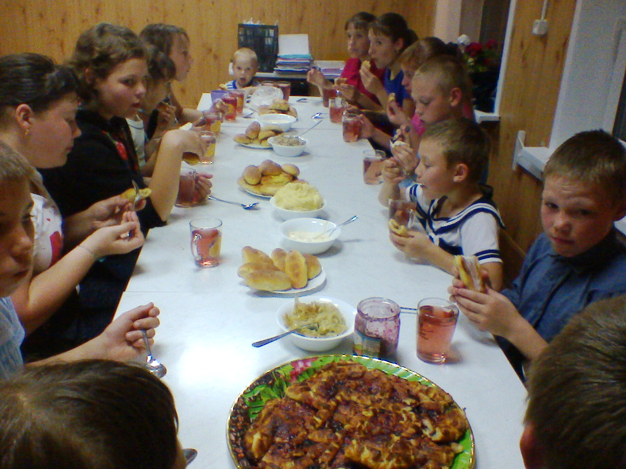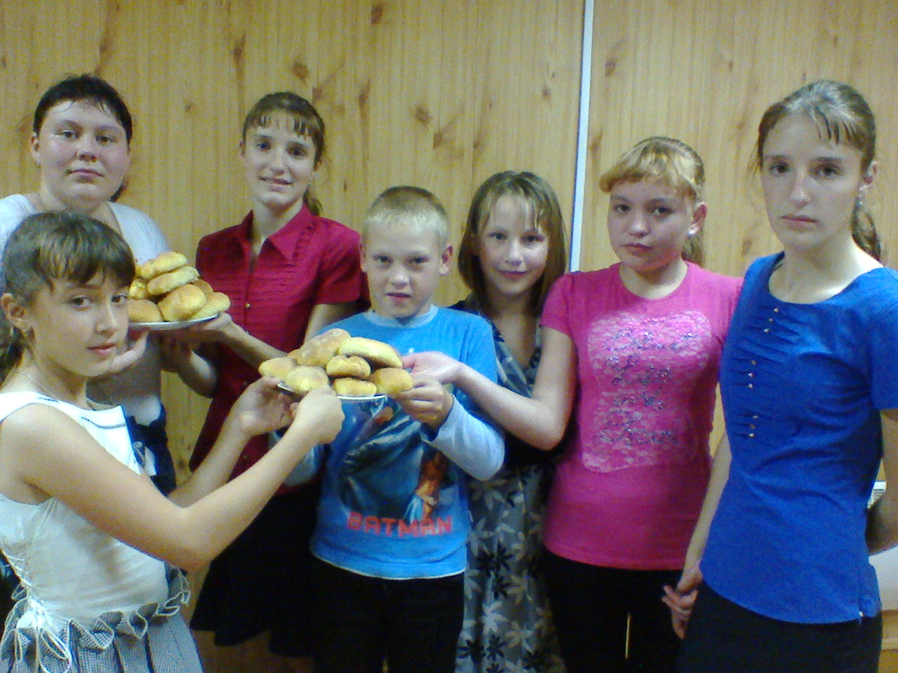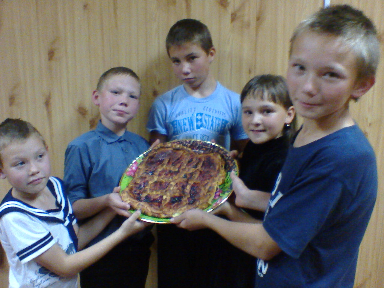 Команда мальчиков и одна девочка вместе с хозяйкой испекли сладкий пирог, а остальные дети с хозяином постряпали пирожки с разными начинками. Хозяин с хозяйкой испекли пироги и пригласили детей и педагогов за общий стол.